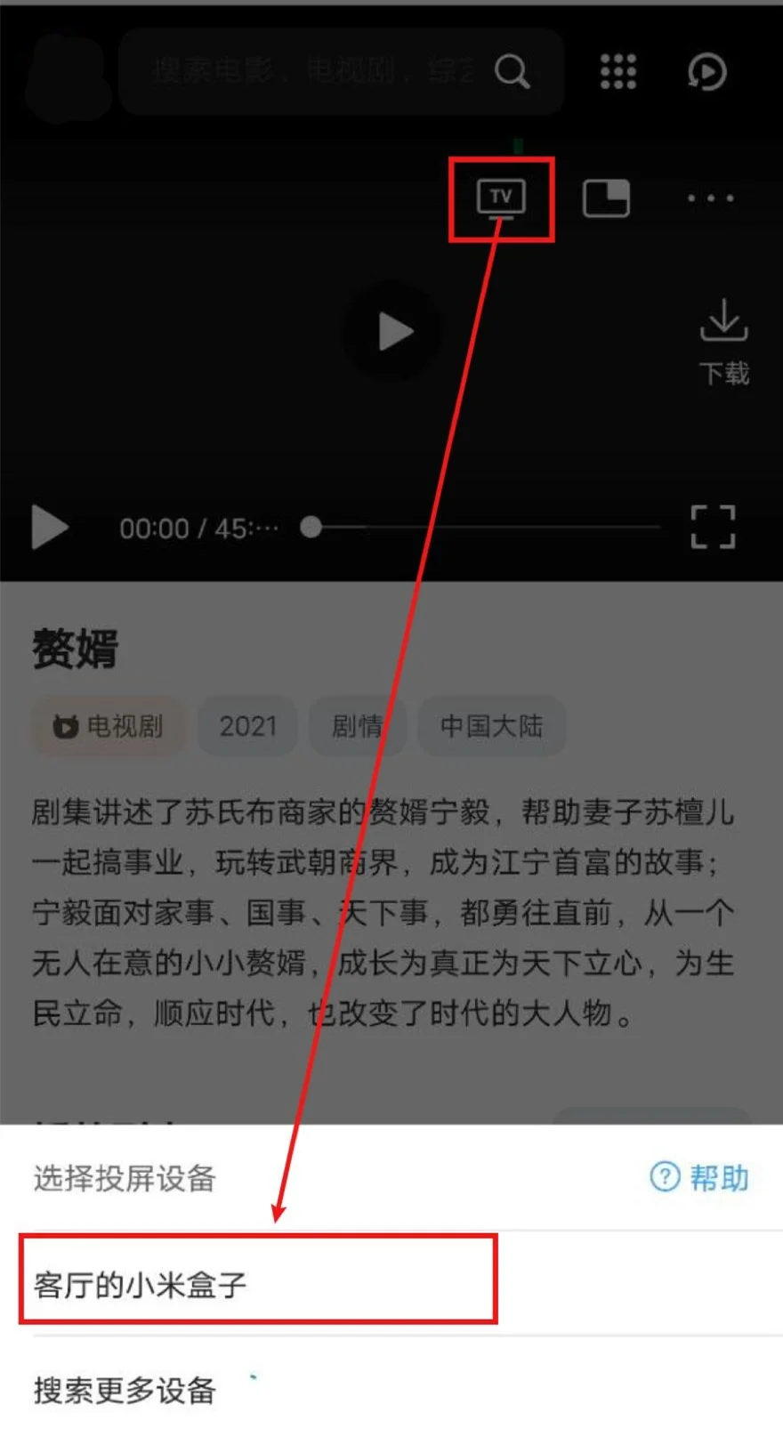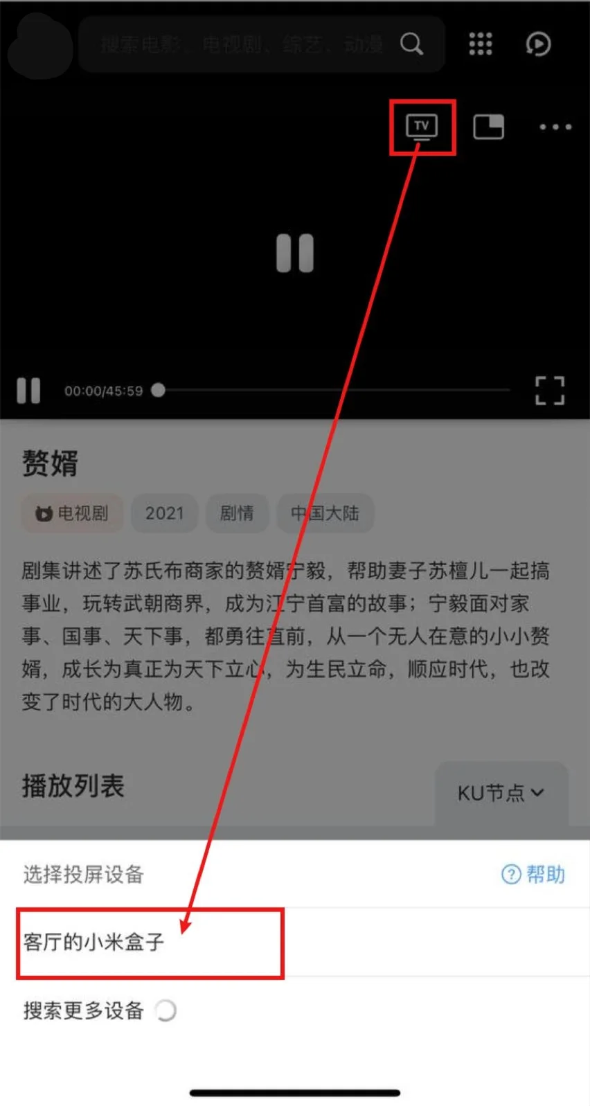 打开QQ浏览器(会接管网页播放器)->打开众发28短剧->播放视频->选中投屏图标->等待搜寻出智能电视/电视盒子->选中,即可投屏。